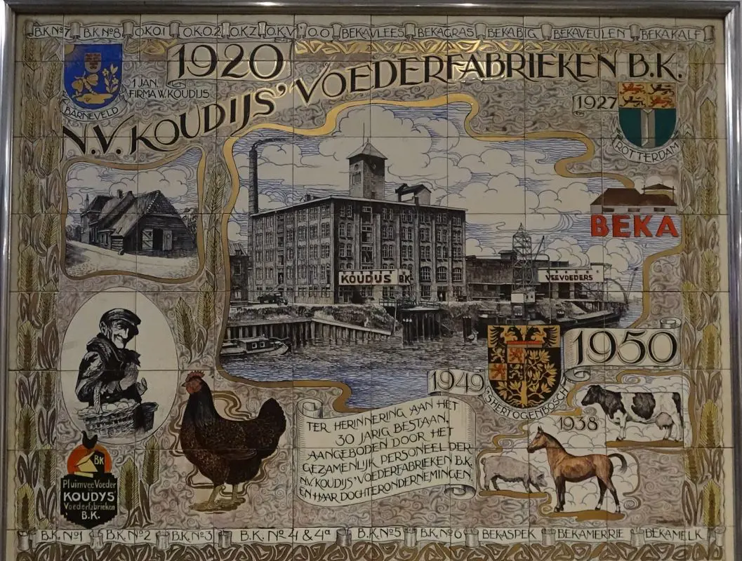 In 1938 the product range was expanded from poultry feed towards feeds for cattle and horses. In 1949 the production of all feed products were brought together in a new factory in Den Bosch. The 30-year anniversary of Koudijs was celebrated in style. The employees designed and gifted a tile panel which depicted key historic milestones to date to mark this anniversary. This tile panel can be admired in the poultry museum in Barneveld. Around 1960 the first activities outside of Europe were initiated and the acquisition of Zwaardermaker in 1964 marked the start of the new logo, the K with the red dot. This logo remains in use untill today. Koudijs continues to expand with an acquisition of the NJ Wouda's factories NV in Sneek.